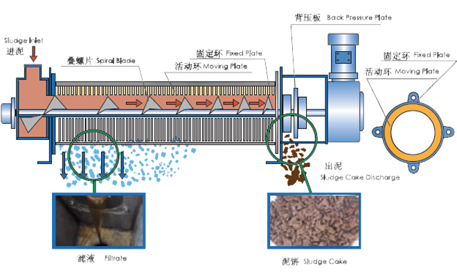 設備運行時,污泥從進料口進入濾筒后受到螺旋葉片的推送向卸料口移動,由于螺旋軸葉的螺距逐漸縮小,因此污泥所受到的壓力也隨之不斷增加,并在壓力的作用下開始脫水,水從固定環與游動環的間隙流出,同時設備依靠固定環也游動環之間的自清洗功能,清掃過濾間隙不易堵塞,泥餅經過脫水后在螺旋軸的推進作用下從卸料口排出。